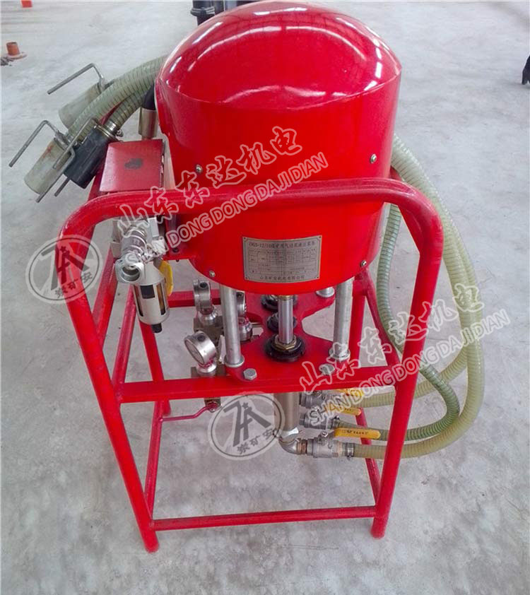 气动双液注浆泵以压缩空气为动力源,由于气缸和注浆缸具有较大的作用面积比,从而以较小的气压便可使注浆缸产生较高的注浆压力。气动双液注浆泵主要由气动马达、柱塞泵、带节流和过滤装置的调压器、压力表等组成,各缸直立布置,受力条件好,气缸的往复运动采用先进的内置阀控制,双向驱动,安全可靠,容积率大幅提高,耗气量低,节能效果显著,各注浆缸为单杆双作用缸,从而能够实现连续排浆,浆液混合均匀,注浆压力波动小。