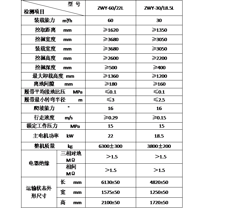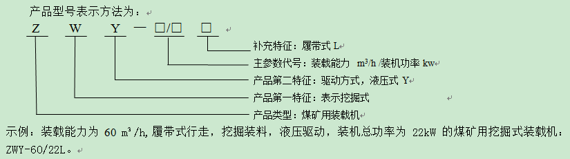 示例:装载能力为60 m³/h,履带式行走,挖掘装料,液压驱动,装机总功率为22kW的煤矿用挖掘式装载机:ZWY-60/22L。