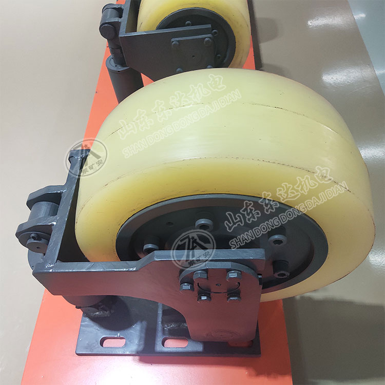 根据滚轮磨损情况,应对滚轮进行调整,方法是松开螺杆锁紧螺母,转动螺杆使滚轮靠向罐道,间隙0~2mm,调好后紧固锁紧螺母。